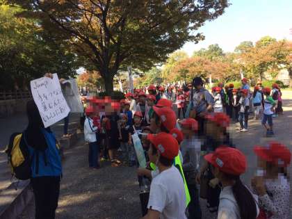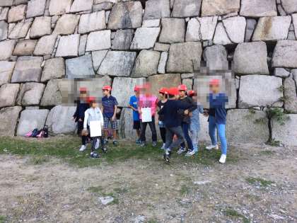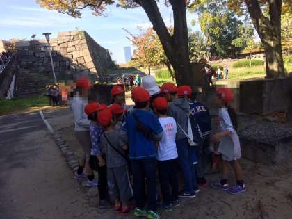 大阪城の西の丸庭園から、各ふれあい班のファミリー(班の中のグループ)ごとに5年生がリーダーとなりオリエンテーリングに出発しました。写真やビデオをとったりダンスやクイズをしたり、グループで相談しながら楽しくポイントをまわっていました。6年生が慣れない5年生を上手にサポートしてくれて、無事にふれあい班での遠足を実りあるものにすることができました。