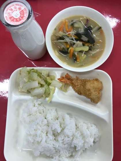 エビフライ、豚汁、キャベツのカツオ梅風味、ご飯、牛乳