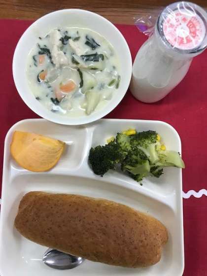 ホタテ貝のクリームシチュー、ブロッコリーのサラダ、柿、牛乳、ライ麦パン