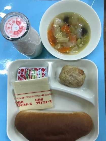 豆腐ハンバーグ、スープ煮、スライスチーズ、黒糖パン、牛乳