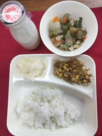 鶏肉と野菜の煮物、じゃこまめ、かぶの柚子風味、ごはん、牛乳