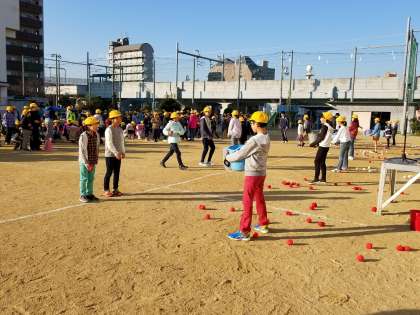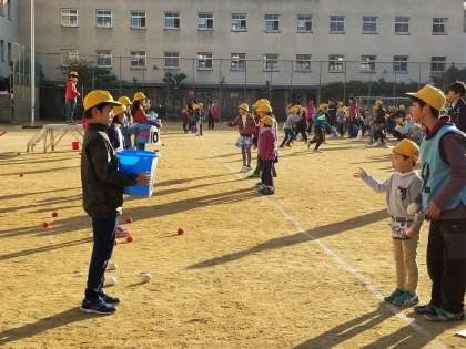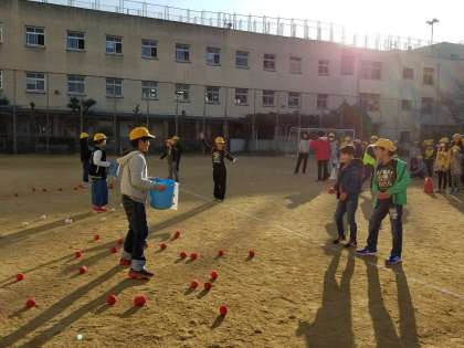 集会委員の持っているバケツに向けて紅白玉を投げ入れます。スペシャルバージョンなので、途中で集会委員の持っているバケツが動きます。
