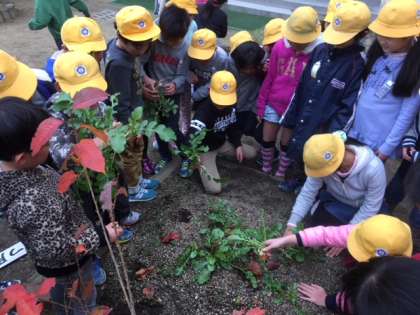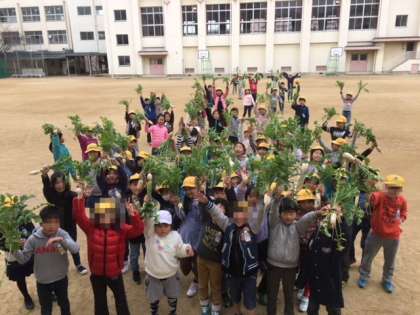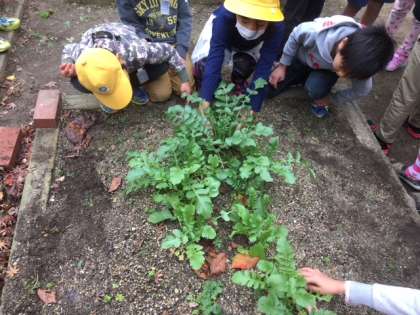 12月8日金曜日に、学習園で育てた田辺大根を収穫しました。毎日、水をやったり、雑草を抜いたりと頑張って育てた田辺大根は、すくすくと成長し、立派な大根になりました。まだまだ小さい大根もありましたが、1人一本は、持ち帰れるほどたくさん収穫できました。
