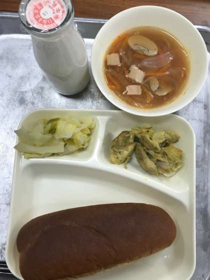 鶏肉のカレー風味やき、ミネストローネ、サワーキャベツ、黒糖パン、牛乳