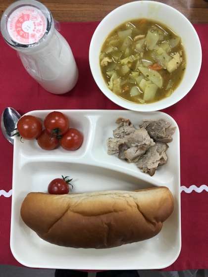 ふだ肉の醤油マヨネーズ焼き、カレースープ、プチトマト、黒糖パン、牛乳