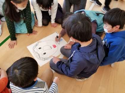 お題の先生の顔を、ふれあい班のみんなで協力してかきます。