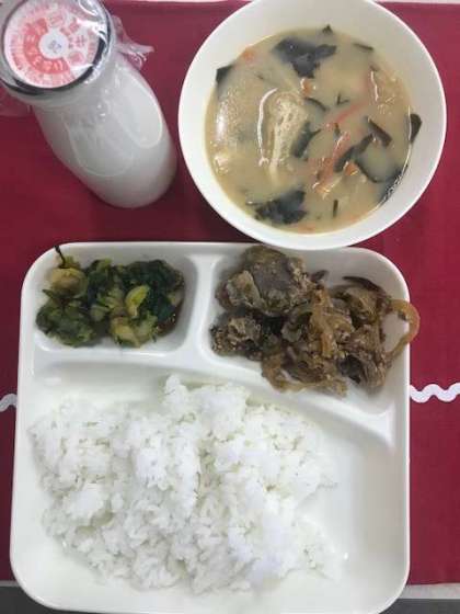 豚肉のゴマだれ焼き、味噌汁、きくなと白菜のおひたし、ご飯、牛乳