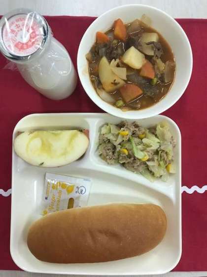 ビーフシチュー、ツナとキャベツのソテー、りんご、パン、牛乳
