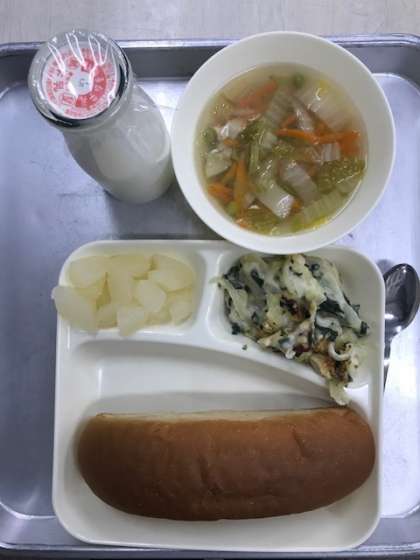 ホタテがいのグラタン、スープ、和梨の缶詰め、パン、牛乳