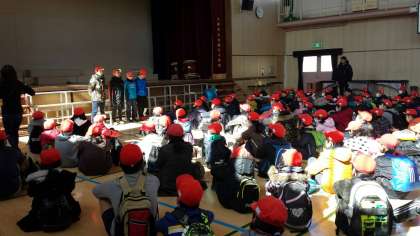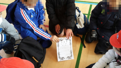 学校につき、閉会式で校長先生より記録証をいただき、グループで仲良く見合っていました。