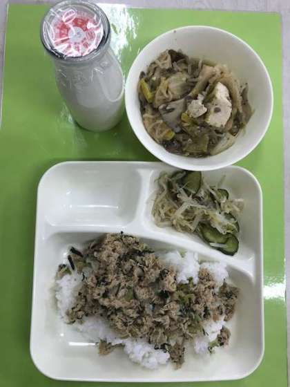 すき焼き煮、もやしときゅうりの生姜漬け、ツナっぱ炒め、ご飯、牛乳