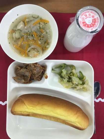 豚肉のデミグラスソース、スープ、キャベツとピーマンのソテー、牛乳、パンプキンパン