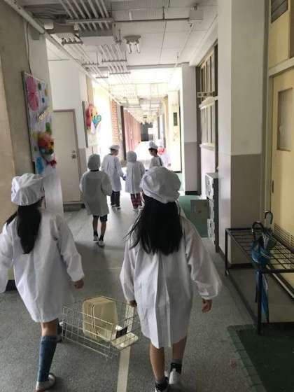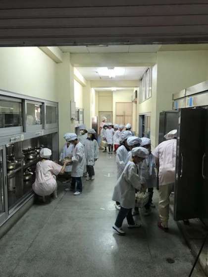 昨日から給食がはじまっています。今日のメニューは何かな?と楽しみにしながら給食室にとりにきています。今日はみんなの大好きなカツカレーです。
