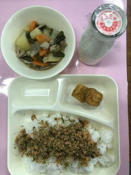 鶏肉とジャガイモの煮物、厚揚げの醤油だれかけ、紅鮭そぼろ、ご飯、牛乳