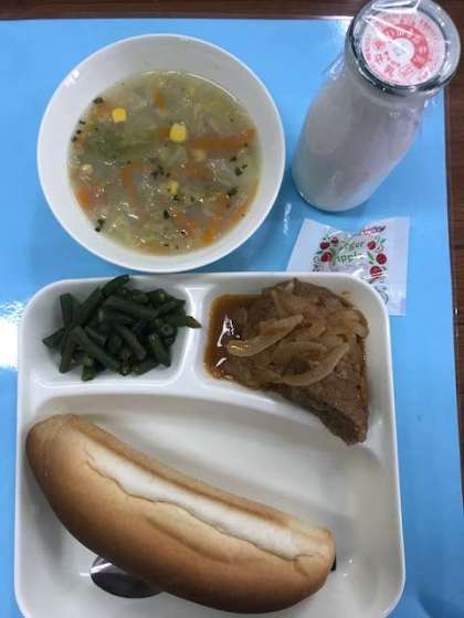 煮込みハンバーグ、コーンスープ、さんどまめのサラダ、コッペパン、りんごジャム、牛乳