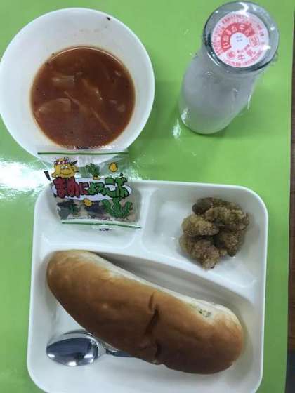 一口トンカツ、ミネストローネ、豆こんぶ、牛乳、おさつパン(初登場)