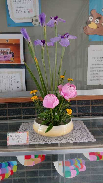 花菖蒲としゃくやく。鯉のぼりと一緒に子ども達の成長を見守っているようです。