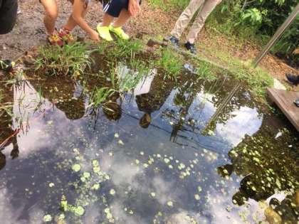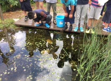 今日は、ビオトープにいるクロメダカを網ですくい観察しました。これから、どんな環境がメダカにとって住みよいのかも考えながら、メダカが卵を産み、成長していく様子を観察していきます。