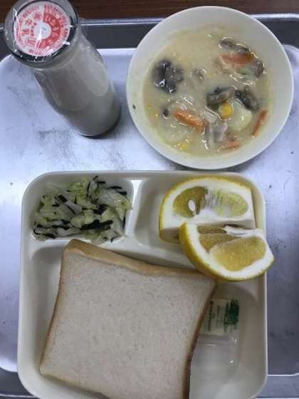 コーンクリームシチュー、キャベツのひじきドレッシング、かわちばんかん、食パン、牛乳