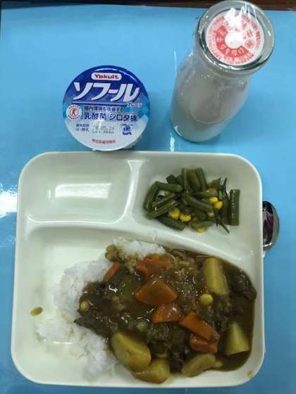 牛肉と大豆のカレーライス、三度豆とコーンのサラダ、ヨーグルト、牛乳