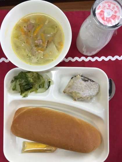 カツオとガーリックマヨネーズ焼き、スープ、レタスのサラダ、コッペパン、牛乳