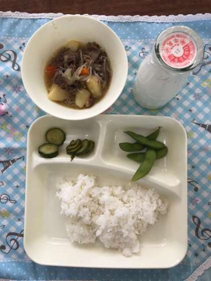 肉じゃが、きゅうりのかつお梅風味、枝豆、