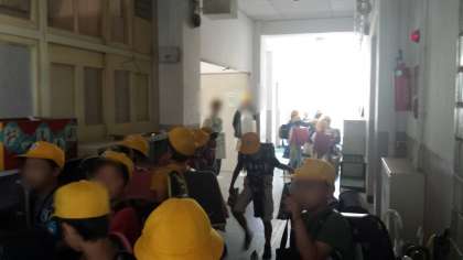 8時に集まり、首からあいさつメッセージをかけて、それぞれの場所につきました。登校してくるみんなに元気よく笑顔で「おはようございます!」と声をかけます。