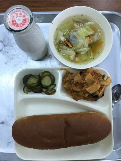 じゃがいものミートグラタン、スープ、きゅうりのピクルス、黒糖パン、牛乳