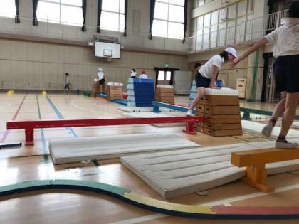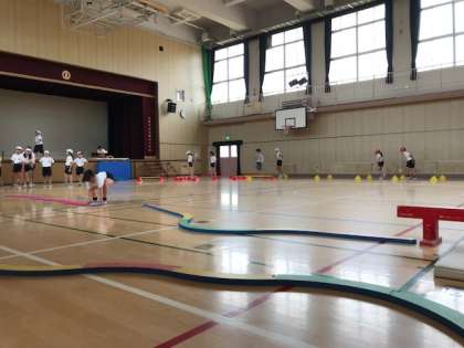 平均台や跳び箱、ミニハードルやマットを使ったサーキット「北田辺サスケ」を体育の時間に行いました。