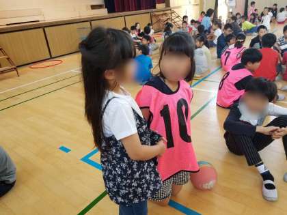 ボールをまわして、合図のときに持っていたらその人が名前と好きなものを1つ言うゲームです。1年生があたり、発表に困っていたら6年生が優しく助けてあげていました。ふれあい班が仲良く、ゲームを楽しんでいました。