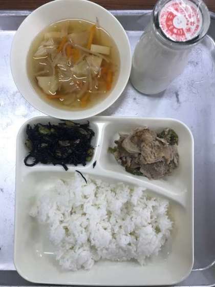 豚肉のごまだれやき、五目汁、ひじきの炒め物、ご飯、味噌汁