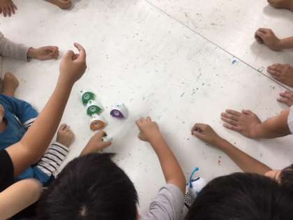 今日は、実際にイモムシ型のロボットを動かしながら、どうすれば目的の場所へたどり着けるかをみんなで試行錯誤していました。