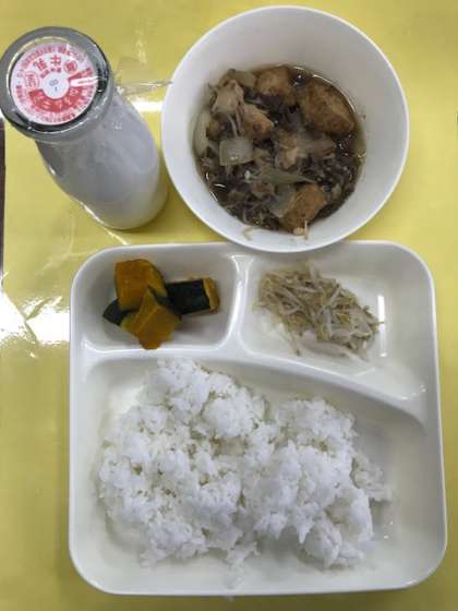 すき焼き煮、焼きかぼちゃの甘蜜かけ、もやしのこまず和え、ご飯、牛乳
