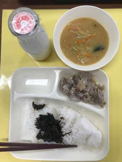 豚肉のゆずの香焼き、味噌汁、海苔の佃煮、ご飯、牛乳