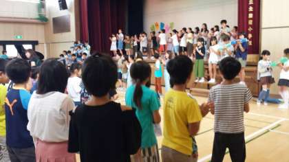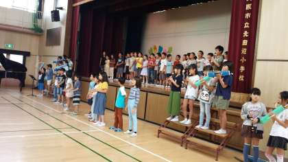 お礼に全校で「おはよう」の歌を歌いました。4年生が楽器演奏などで盛り上げてくれて、いっそう楽しく歌えました。