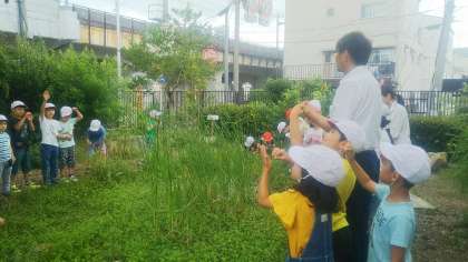 蜜蜂の大切な役割や自然にとって大切なものを学習した後、「ビオトープ」に移動して自然の観察をしました。
