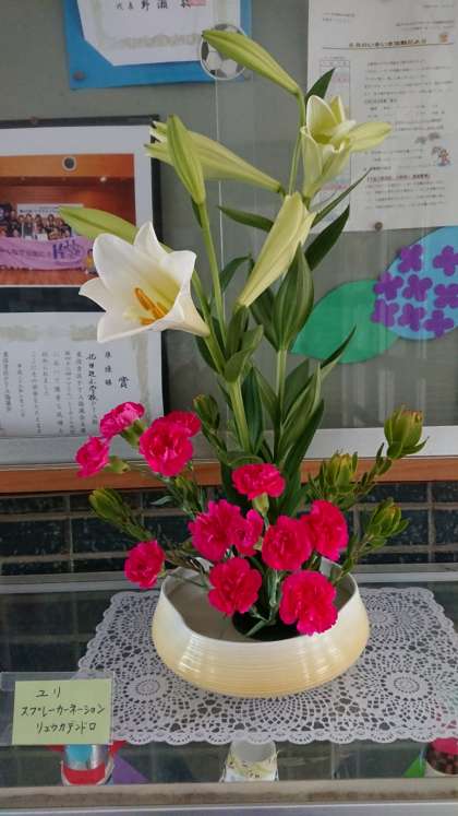 凛としたユリと、かわいらしいスプレーカーネーション。