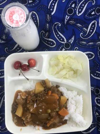 ハヤシライス、キャベツの柚子ドレッシング、さくらんぼ、牛乳