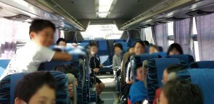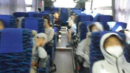 バスの中では、レクリエーションを楽しんだり、ゆっくり休んだり、それぞれに過ごしています。