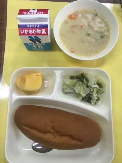 コーンクリームシチュー、キャベツと三度豆のサラダ、かき、牛乳、黒糖パン