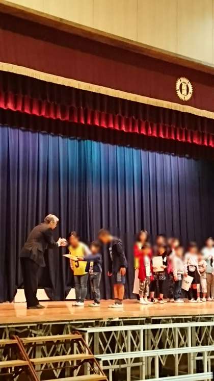 5年生を中心に頑張ったふれあい遠足。みんな、キラキラ笑顔で賞状を受け取っていました。