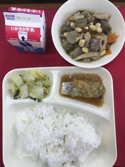 さごしのおろし醤油がけ、ごもく豆、白菜の甘酢あえ、ご飯、牛乳