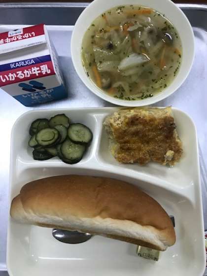 ツナポテトオムレツ、スープ、きゅうりのバジル風味サラダ、コッペパン、牛乳