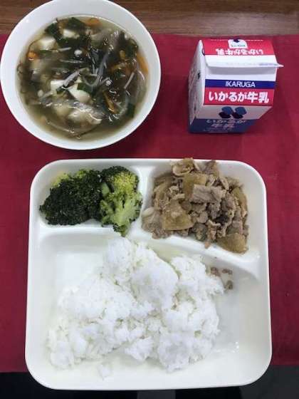 豚肉のコチュジャン炒め、もずくのスープ、ブロッコリーのナムル風あえもの、ご飯、牛乳