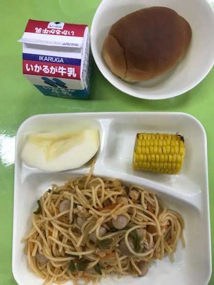チキンとトマトスパゲティ、焼きとうもろこし、りんご、牛乳、黒糖パン