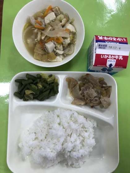 豚肉の生姜醤油かけ、けんちん汁、三度豆の辛子醤油和え、ご飯、牛乳