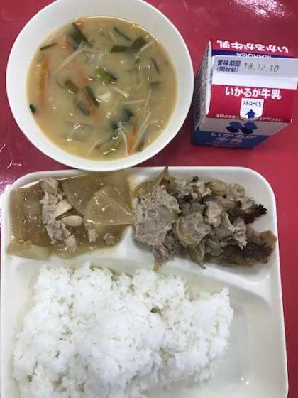 豚肉の生姜焼き、味噌汁、大根の煮物、ご飯、牛乳