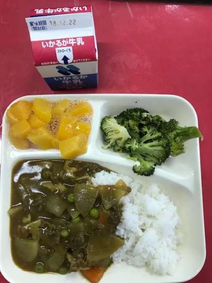 冬野菜カレーライス、ブロッコリーサラダ、黄桃、牛乳
