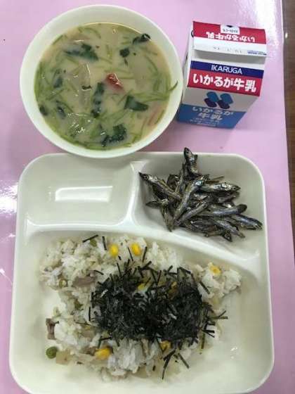 れんこんのちらしずし、雑煮、ごまめ、牛乳