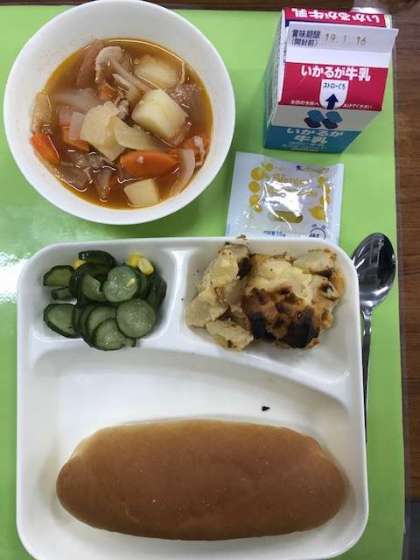 豚肉と野菜のケチャップ煮、きゅうりとコーンのサラダ、桃のクラフティ、コッペパン、牛乳